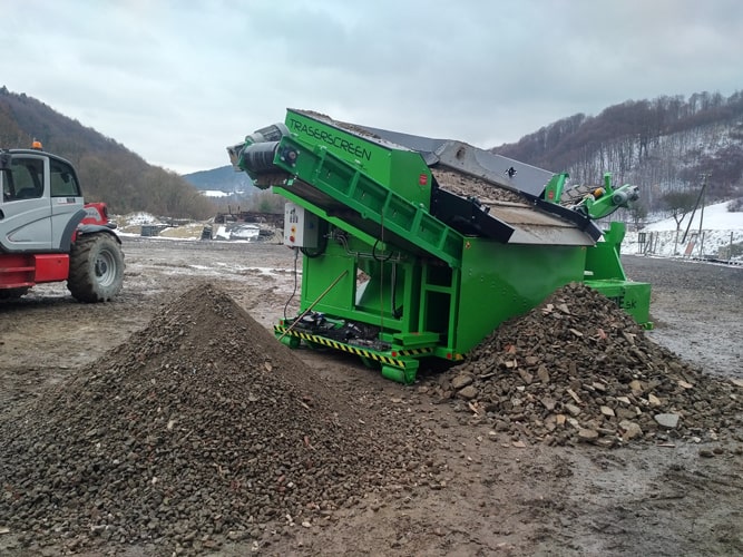 Posibilidad de cambiar el tamaño de las fracciones resultantes en cualquier lugar, rápida y fácilmente gracias a tamices duraderos, arbitrariamente de 4 mm a 80 mm. El accionamiento lo proporciona una unidad hidráulica con una potencia de 5,5 kW.